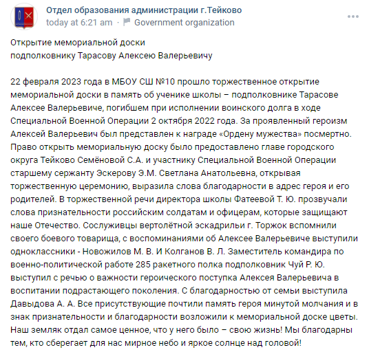 On February 22, 2024, at school No. 10 in the city of Teykovo, the grand opening of the “Party of Heroes” was held for school graduates - Alexey Valerievich Tarasov and Sergei Igorevich Taldykin.