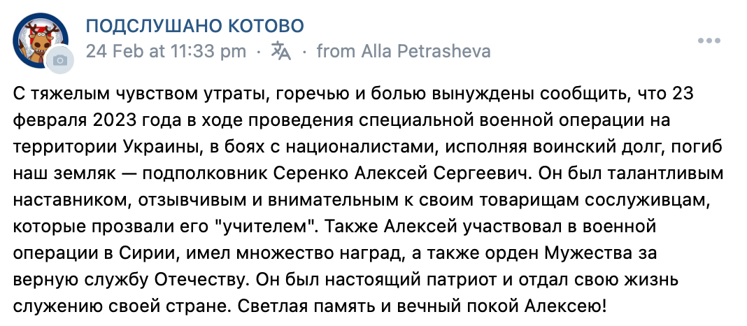 Killed by a rocket artillery strike on his position at 12:00 on February 23, 2023.