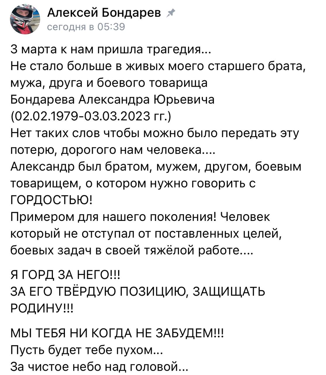 Alexander Yuryevich Bondarev was awarded the title Hero of Russia posthumously, also awarded the Order of Courage and nominated for an award - the medal “For Services to the Fatherland.”