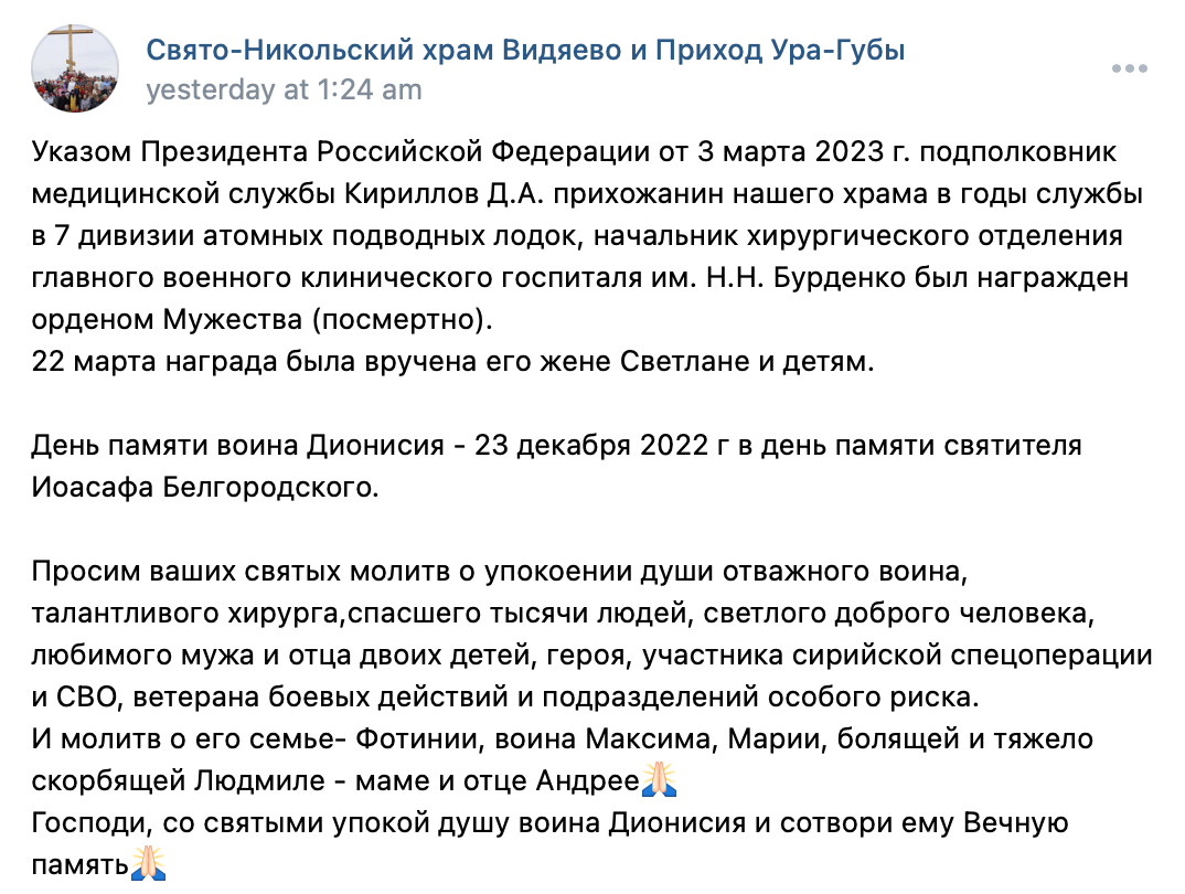 "Since the beginning of the war, for 10 months, with meager breaks, Denis worked in the military hospital of the city of Belgorod. Thousands of operations and lives saved on his account. He died heroically in Belgorod"