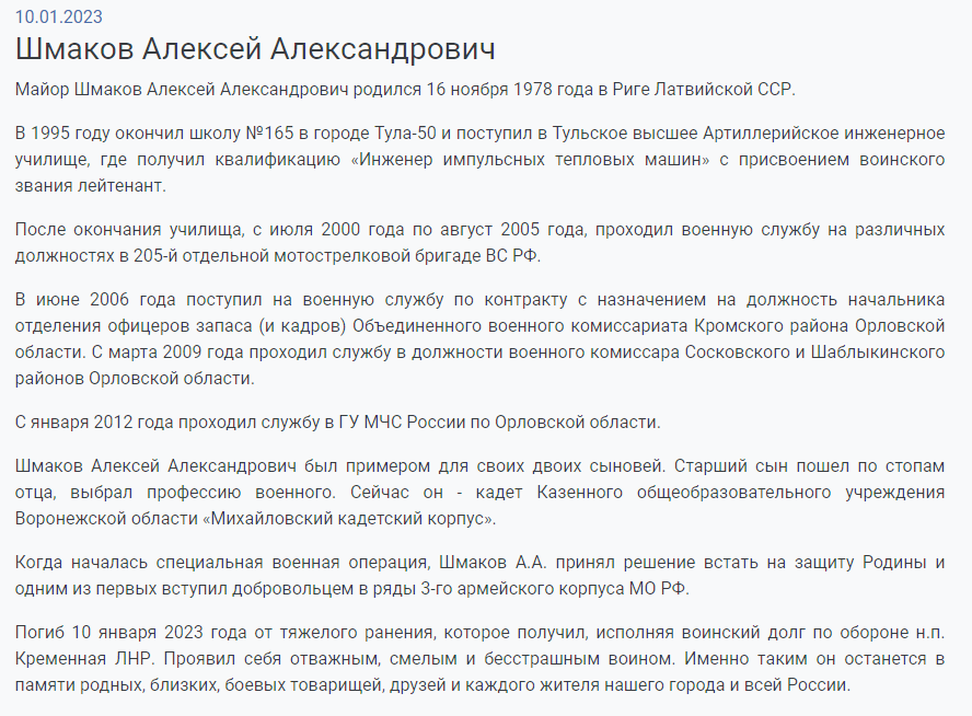 He died on January 10, 2023 from a serious wound that he received while performing military duty to defend the village of Kremennaya, LPR
