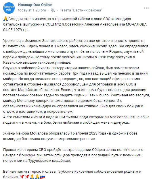"He served in a military unit as deputy commander for educational work. Three years ago he retired with the rank of major. But when the special operation began, he, like a real officer, could not stand aside - he volunteered to be sent to the war zone as part of the Mari battalion."
