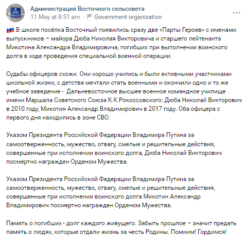 In the school of the village of Vostochny, two "Party of Heroes" appeared at once with the names of graduates - Major Dyub Nikolai Viktorovich and Senior Lieutenant Mikotin Alexander Vladimirovich, who died in the line of military duty during a special military operation.