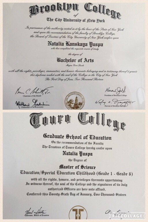 Education: Brooklyn College (graduated 2013, Magna Cum Laude); Touro University, Graduate School of Education, Master of Science in Education/Special Education Childhood (graduated 2016)