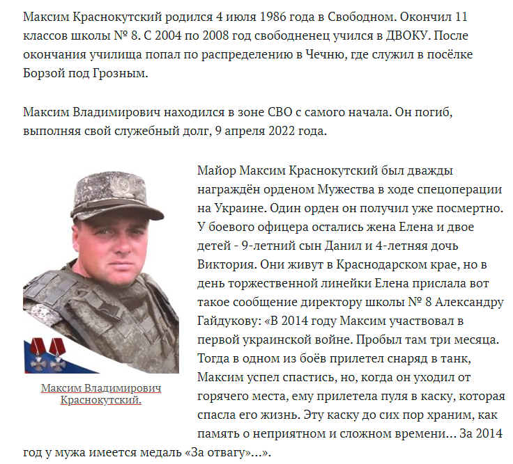 The military officer is survived by his wife Elena and two children - 9-year-old son Danil and 4-year-old daughter Victoria. They live in the Krasnodar Territory, but on the day of the solemn line, Elena sent this message to the director of school No. 8, Alexander Gaidukov:
