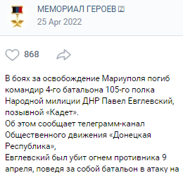 "Pavel died like a real warrior in the battle on April 9 in Mariupol, leading the battalion to attack the positions of Azov"