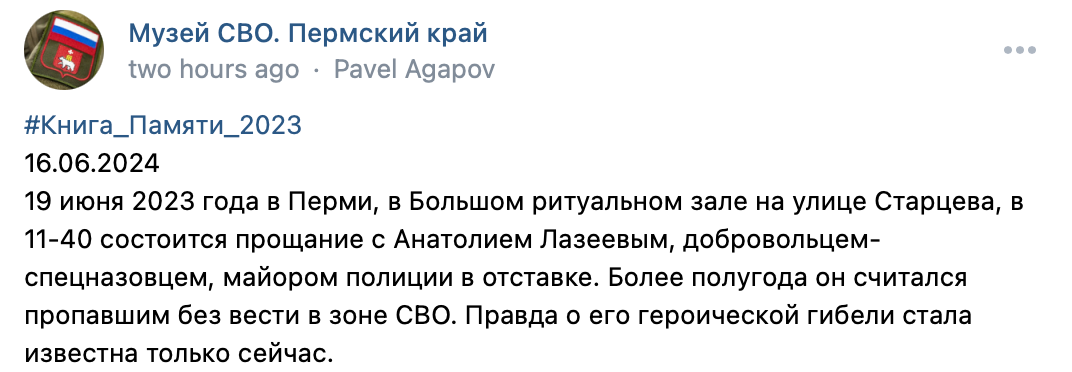 In June 2022, Anatoly Lazeev, being a leading specialist at Uralbumaga LLC, voluntarily went to fight in the NVO zone and immediately found himself in the epicenter of the fighting on one of the hot sectors of the front. On July 24, his branch was attacked by the AFU. In this battle, Anatoly was wounded by a shrapnel in the back, and a burst from a machine gun broke his legs. Four of his comrades were also wounded. Ordering them and other soldiers to retreat, Lazeev took up a shooting position and began to cover the retreat of his comrades with return fire. They managed to escape, but Anatoly was left alone against the attack aircraft of the sabotage and reconnaissance group of the Armed Forces of Ukraine. The ring of enemies around Lazeev continued to shrink. And when they came close to Anatoly, surrounded him, he blew them up and himself with a grenade.