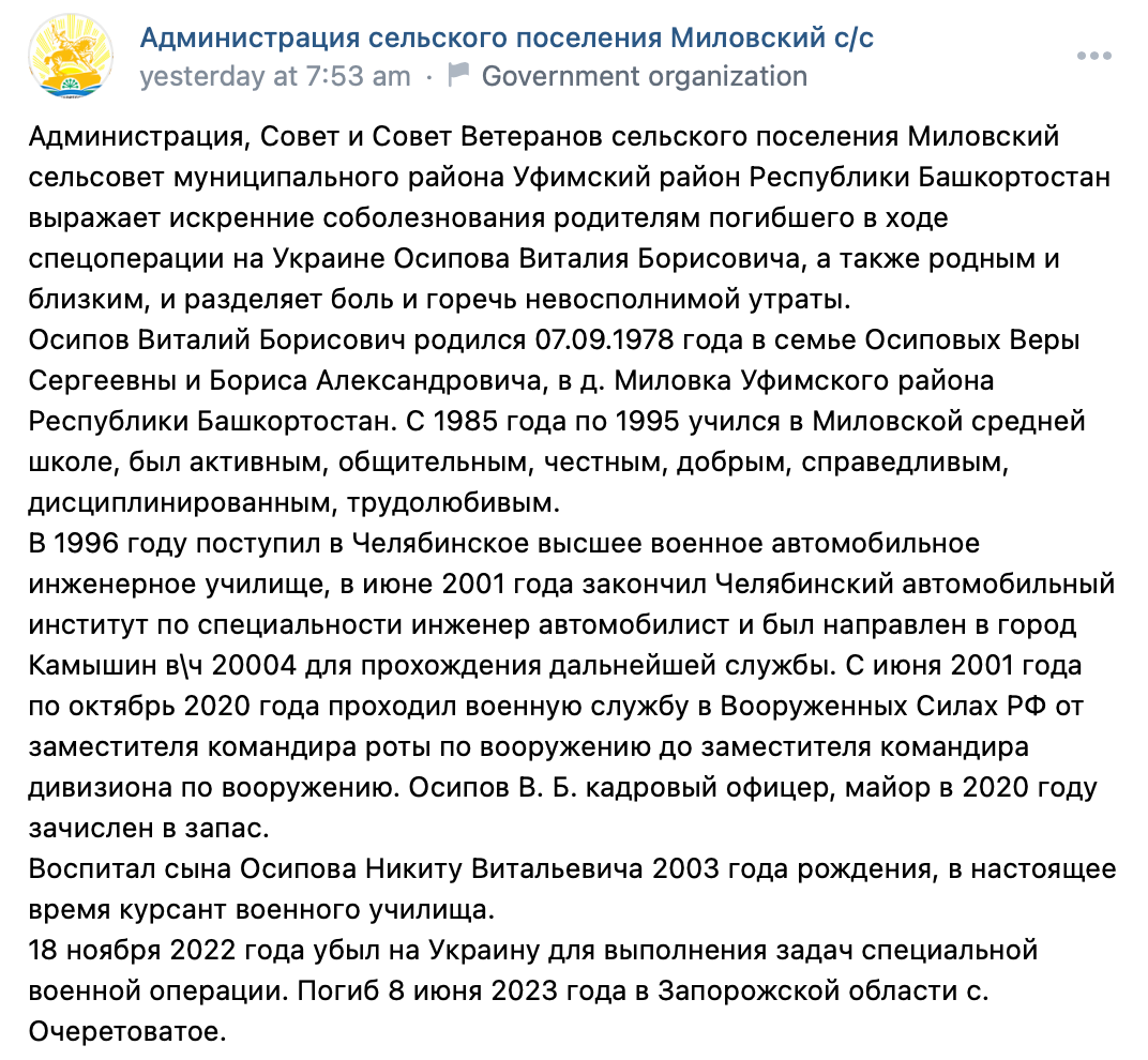 From June 2001 to October 2020, he served in the Armed Forces of the Russian Federation from deputy company commander for armaments to deputy division commander for armaments. Osipov V. B. is a career officer, major in 2020 was enlisted in the reserve.