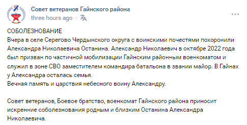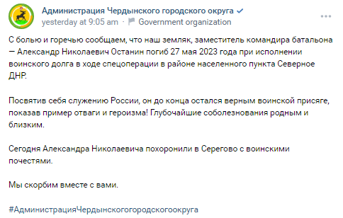 "Mobilized in October 2022, died on May 27, 2023, in the area of a settlement of the Northern DPR"