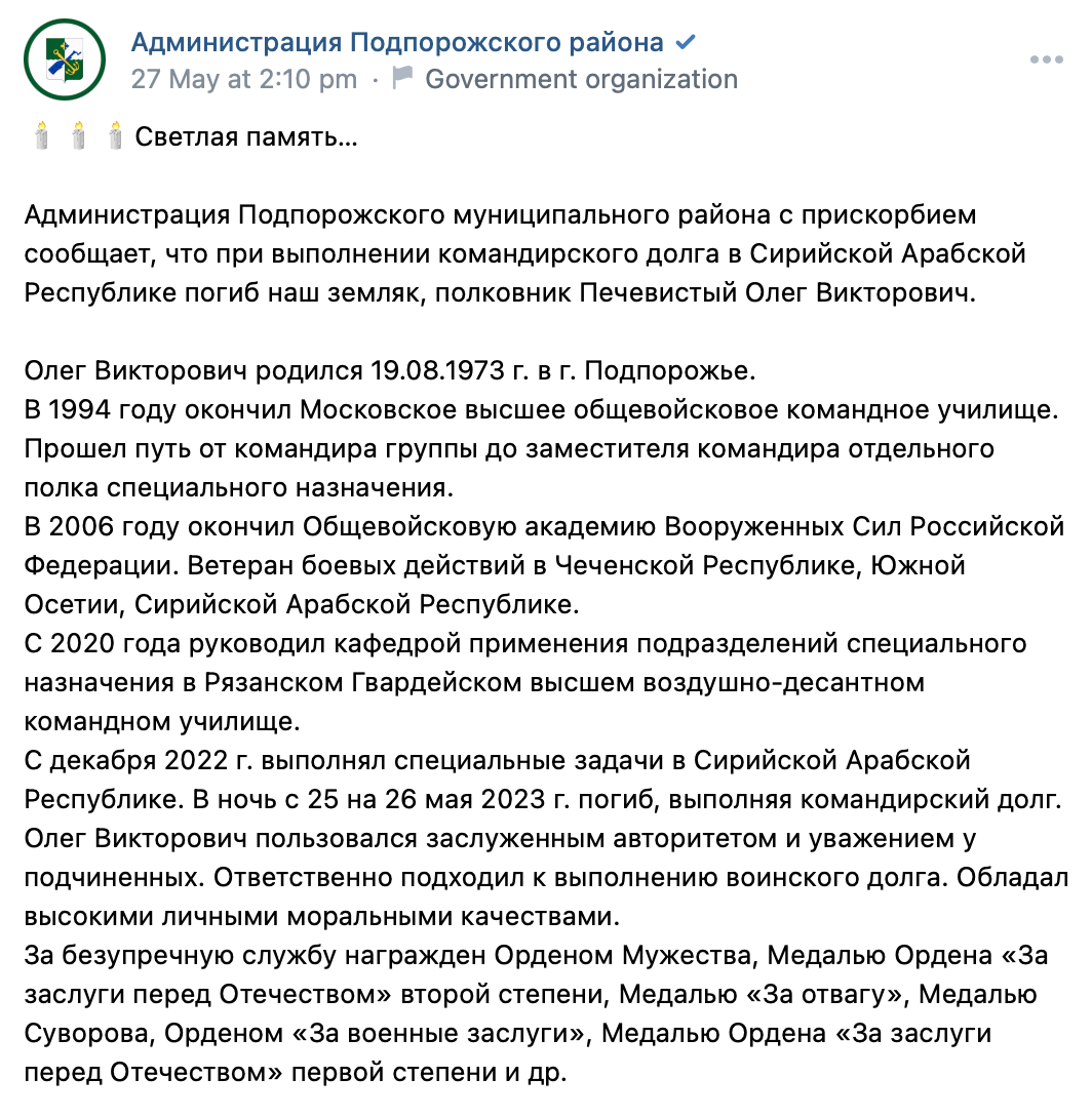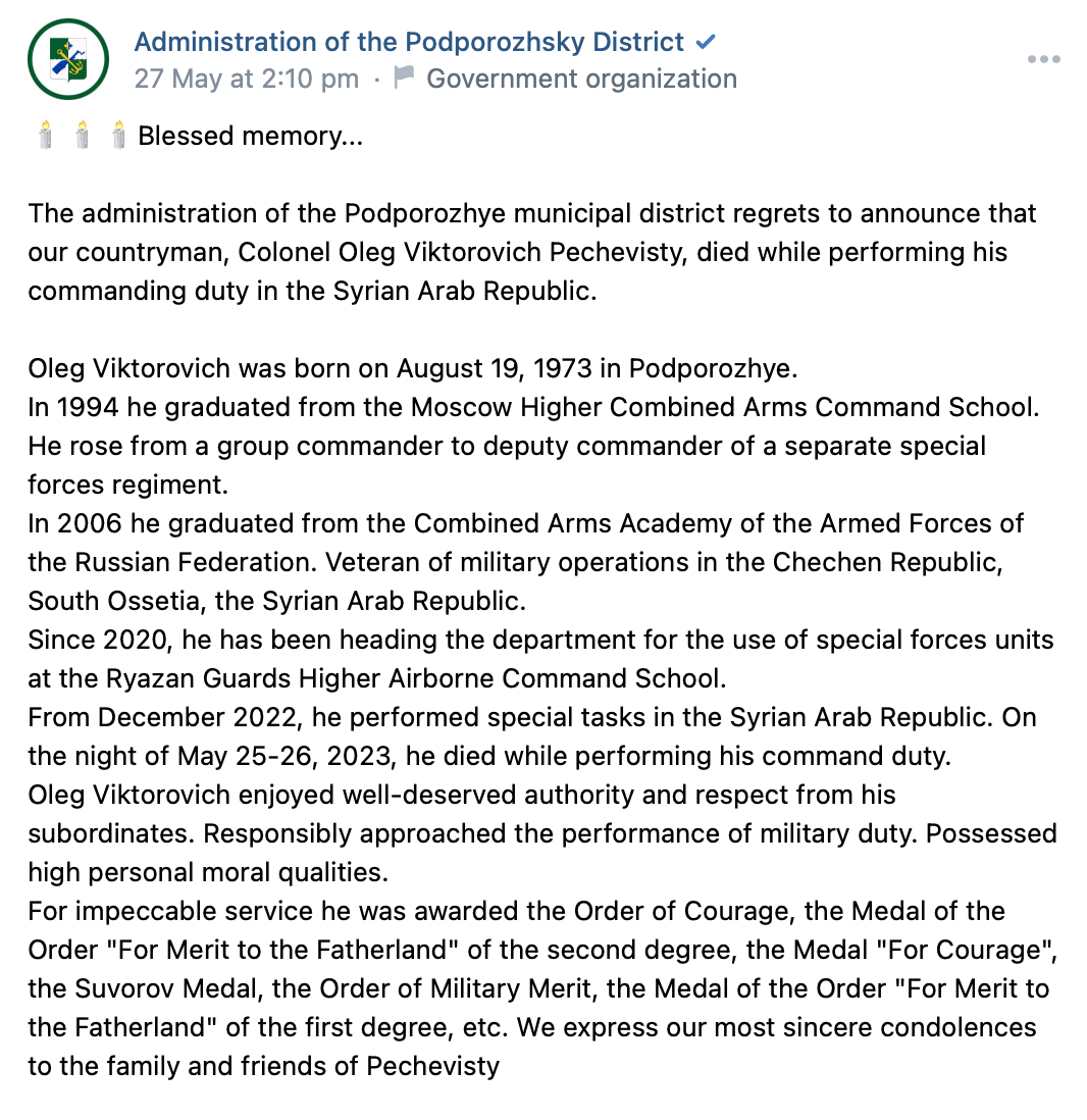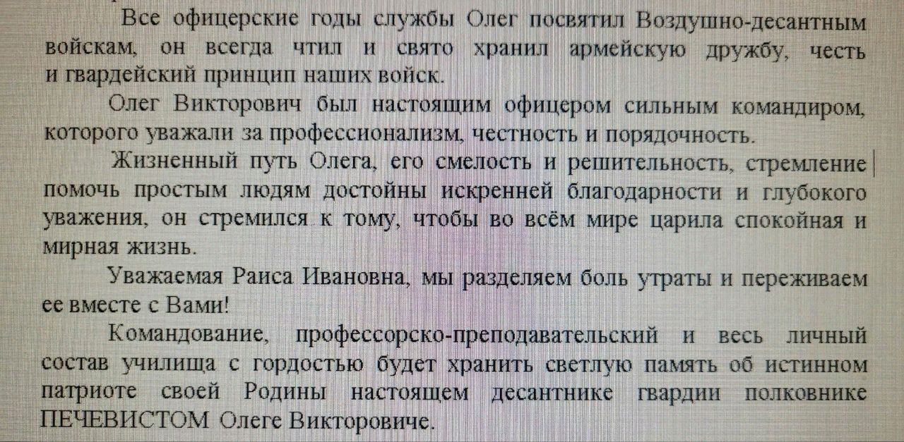 Translation: Oleg devoted all his years of service to the Airborne Forces, he always honored and sacredly preserved the army friendship, honor and guards principle of our troops. Oleg Viktorovich was a real officer of a strong commander, who was respected for his professionalism, honesty and decency. Oleg's life path, his courage and determination, his desire to help ordinary people worthy of sincere gratitude and deep respect, he sought to ensure that a calm and peaceful life reigned all over the world.