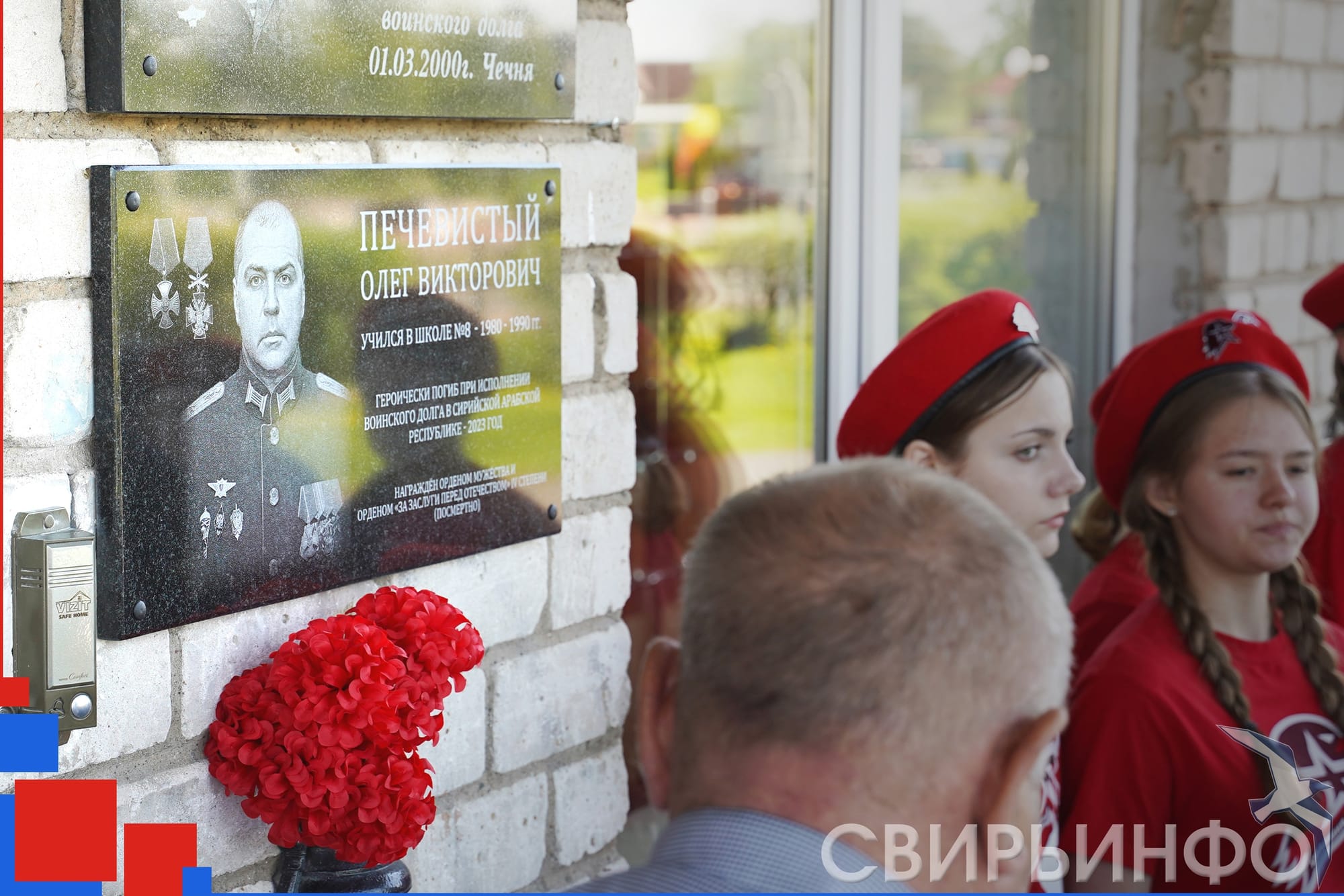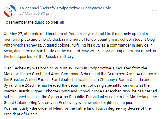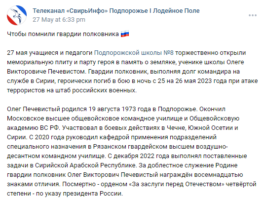 On May 27, students and teachers of Podporozhye school No. 8 solemnly opened a memorial plate and a hero’s desk in memory of fellow countryman, school student Oleg Viktorovich Pechevist. A guard colonel, fulfilling his duty as a commander in service in Syria, died heroically in battle on the night of May 25-26, 2023 during a terrorist attack on the headquarters of the Russian military.