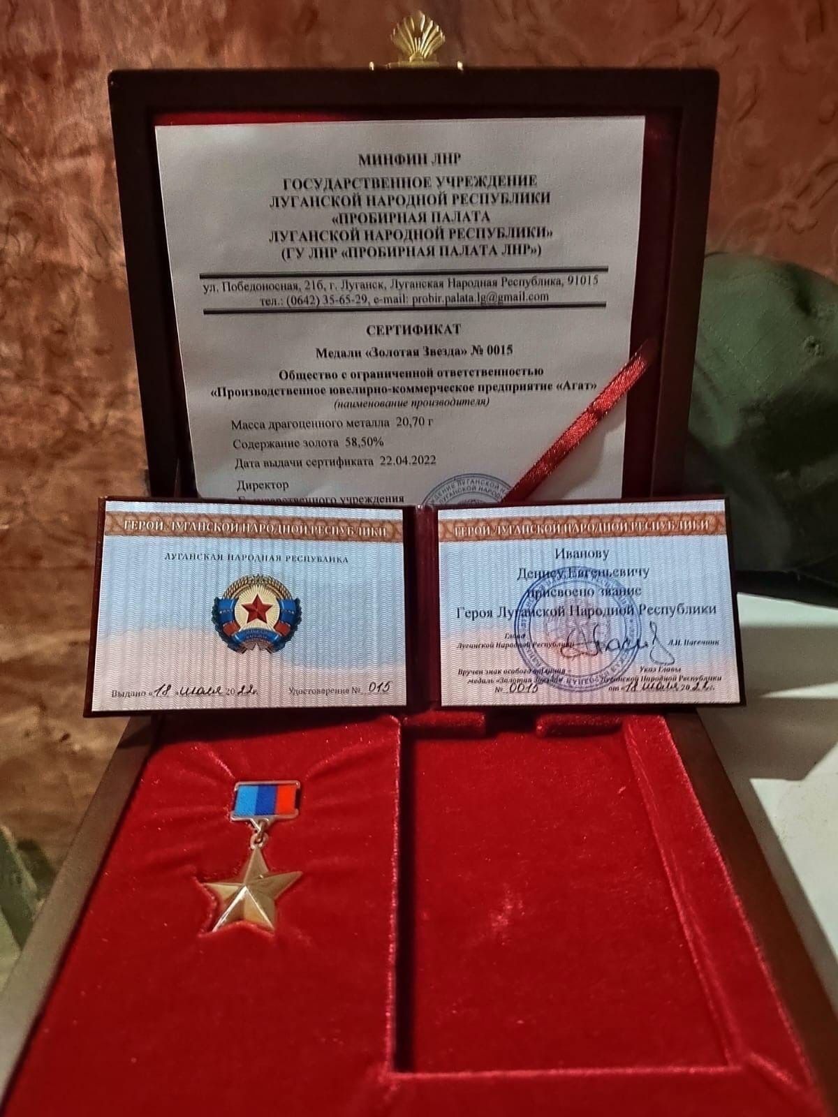 Awards: Hero of Russia, Hero of the LPR (#0015, dated April 22, 2022), Medal "For Distinction in Combat", Medal "For Military Valor" 2nd Class, Medal "For Distinction in Military Service" 2nd Class, Medal "For Distinction in Military Service" 3rd Class, Medal "For Personal Courage", Badge "Officer 1st Class", Badge "Instructor Parachutist", Badge "Graduation from a Higher Education Institution", Badge "Guard"