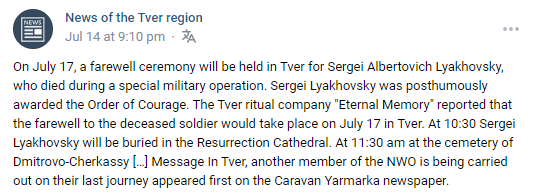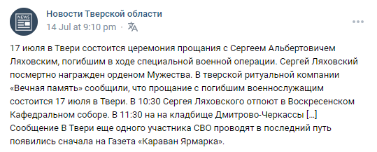 On July 17, a farewell ceremony will be held in Tver for 46-year-old Sergei Albertovich Lyakhovsky, who died in the NWO zone. According to the ritual company "Eternal Memory", the soldier died on June 4, 2023.