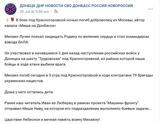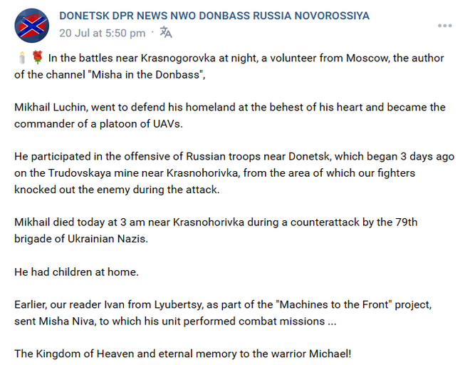 Mikhail Luchin participated in the offensive of Russian troops in the DPR on the Trudovskaya mine near Krasnogorovka, which began on July 17. "Mikhail died today at 3 am near Krasnohorivka during a counterattack by the 79th brigade of the Armed Forces of Ukraine "