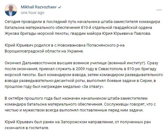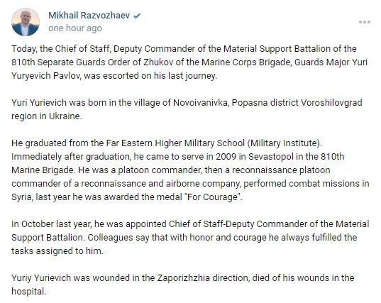 Awards: Order of Courage, Medal "For Courage", Medal of Zhukov, Medal "For Military Valor" 1st Class, Medal "For Military Valor" 2nd Class, Medal "For Distinction in Military Service" 2nd Class, Medal "For Distinction in Military Service" 3rd Class, Medal "Participant of the Military Operation in Syria", Medal "For the Return of Crimea",