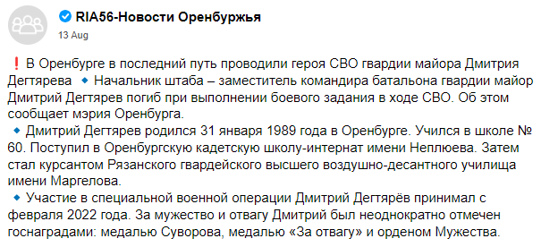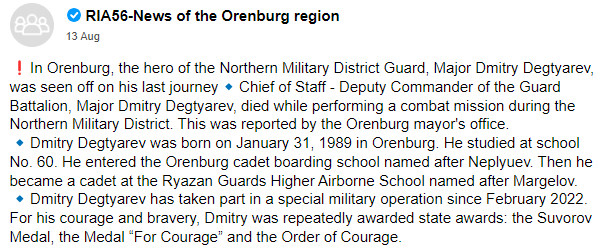 08/04/2023 during the fighting in the Zaporozhye direction, the chief of staff of the battalion of the 56th Guards Airborne Division of the 7th Guards Airborne Forces Guards Major Degtyarev Dmitry Sergeevich was killed