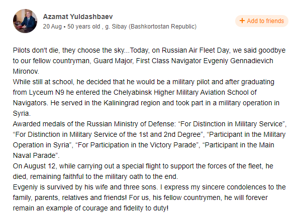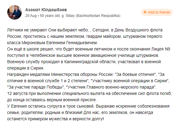 The farewell ceremony for Guard Major Evgeniy Gennadievich Mironov will be held tomorrow, August 20, in Sibay. He died while performing a training flight.