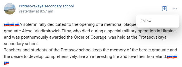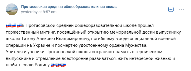 A solemn rally dedicated to the opening of a memorial plaque of graduate Alexei Vladimirovich Titov, who died during a special military operation in Ukraine