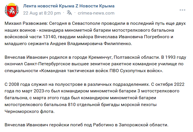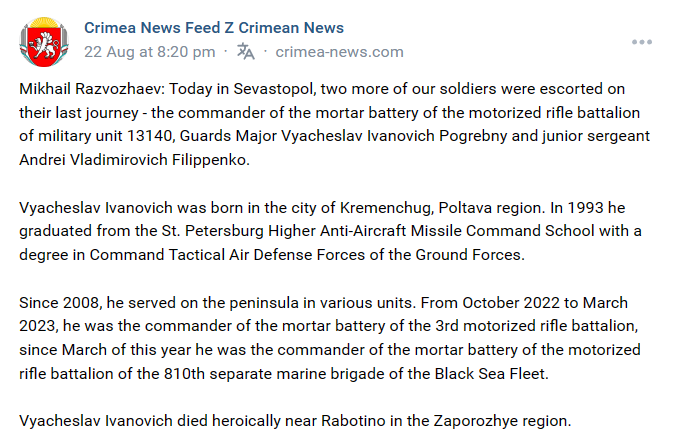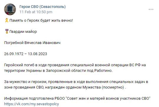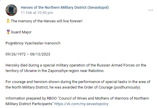 Place of Death: Robotnye, Zaporizhzhia Oblast, Ukraine (herosky)
