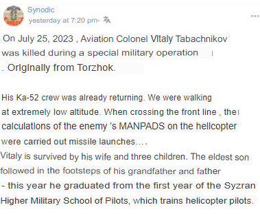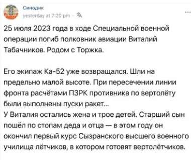 "Friends, hello! Today my brother V. Vitaly died. His helicopter was shot down. I ask for your holy prayers for the repose of his soul! He is survived by his wife Marianna (Maria in baptism) and three children, Masha - 7 years old, Katya - 14 years old and Andrei - 18 years old. Andrei is now studying at the same helicopter school as his father. Katya is in the Cadet Corps.