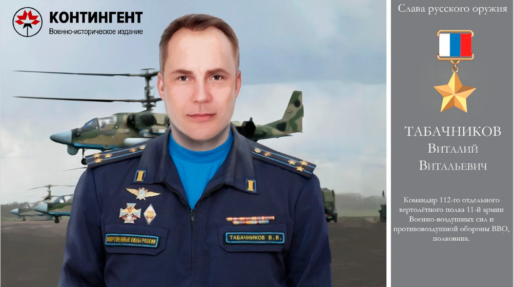 Vitaly Tabachnikov is a Russian pilot, pilot of the Ka-52 helicopter. He was the commander of the 112th Separate Helicopter Regiment (military unit 78081), the 11th Air Force and Air Defense Army of the Russian Armed Forces.