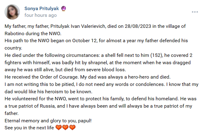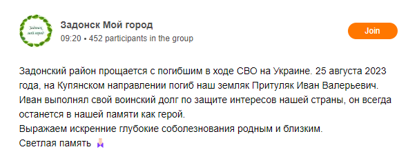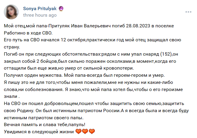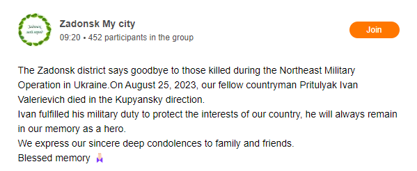 Ivan was redeployed from the Kupiansk area to Robotyne between the 25th to the 28th of August, 2023 where he died.....