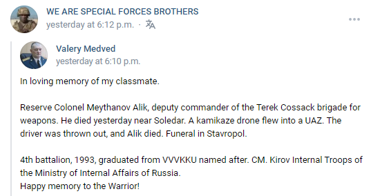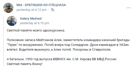 Near Soledar on the 9th of September A kamikaze drone flew into a UAZ. The driver was thrown out, and Alik died, funeral in Stavropol.