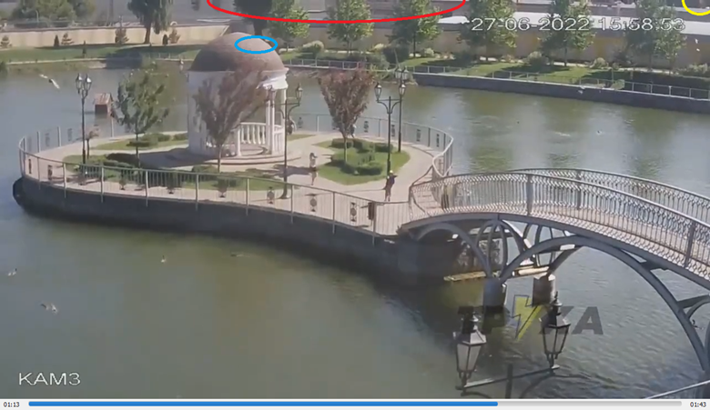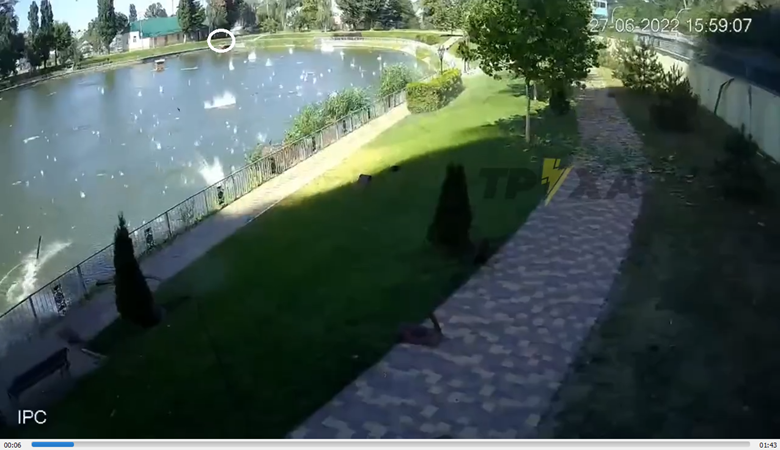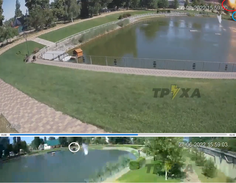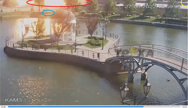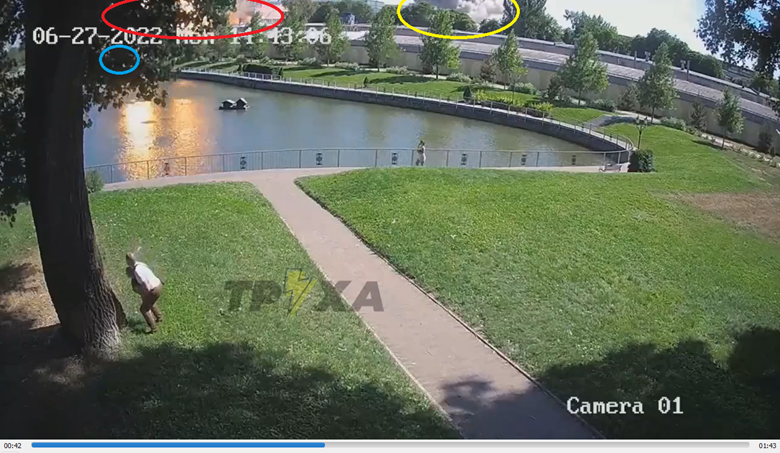 We see the lone person near the boat beginning to stand back up after the first explosion, then trying to take cover after the second. The large piece of debris hitting the pond makes it very clear that the second explosion is the one that was captured by the first camera in this video. The top image here is from the White location, while the bottom image is from the first camera with a view of White.
