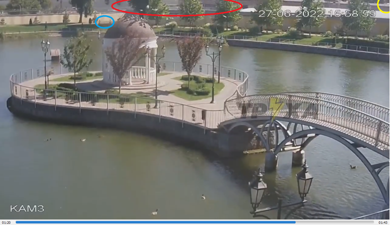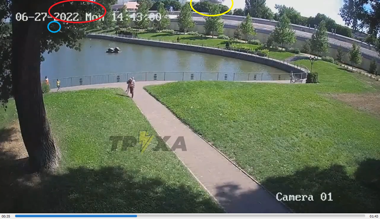 Analyzing the various angles from the park's security cameras gives us an excellent idea of what exactly happened yesterday. I'm going to organize the follow analysis by the play time of the video, not by the actual timestamps of the security cameras, in order to make it easier to follow along with. The colors listed next to each video timestamp refer to the colors of the circles on the image above, and indicate the location of the camera recording the footage.
