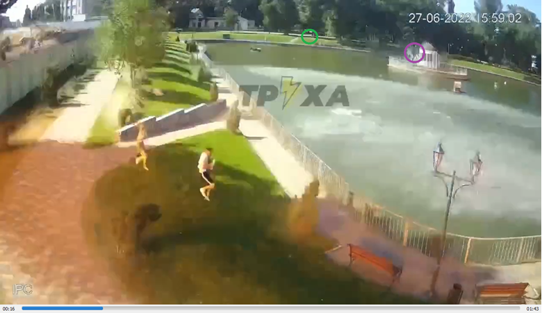 The second explosion occurs very close to the runners. This is where we can see the debris rain down exactly as in the first section of the video. The man throws himself into the pond and the woman takes off running Northwest (toward Green).